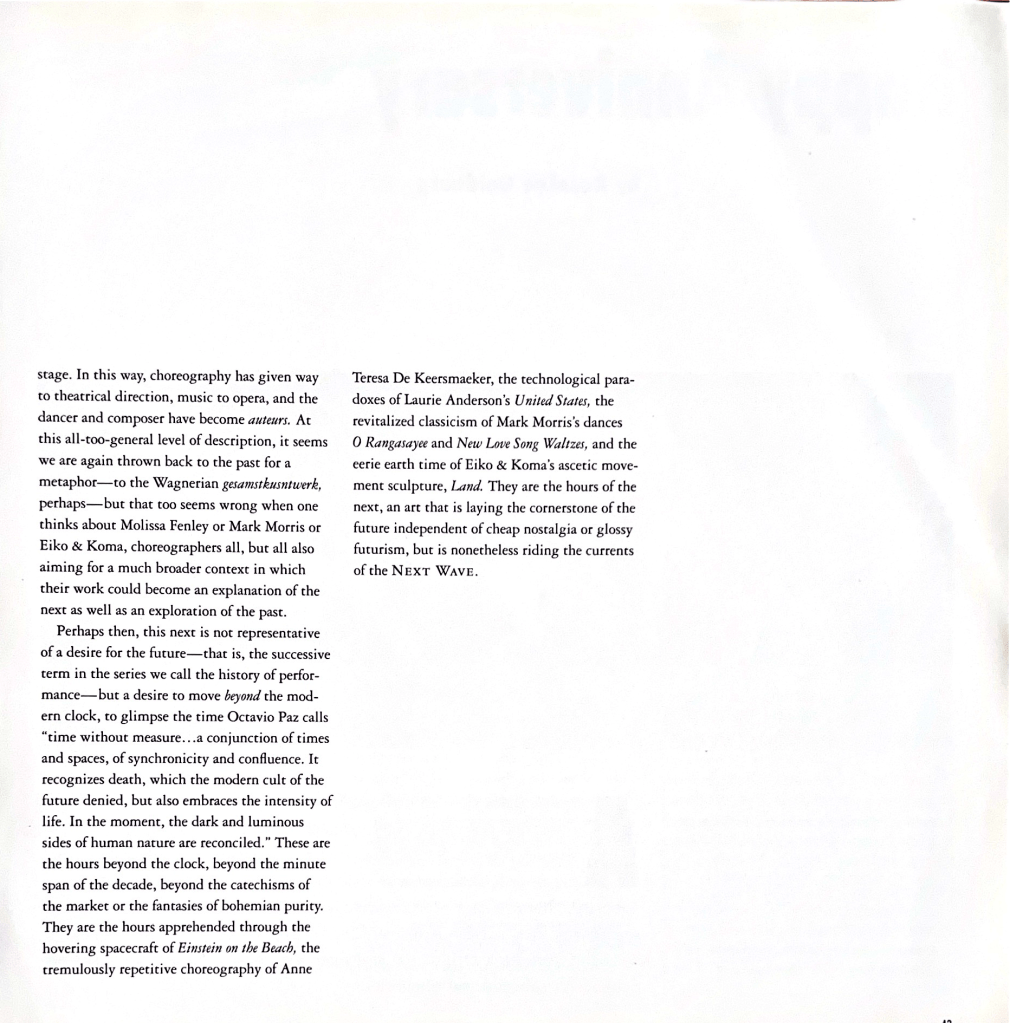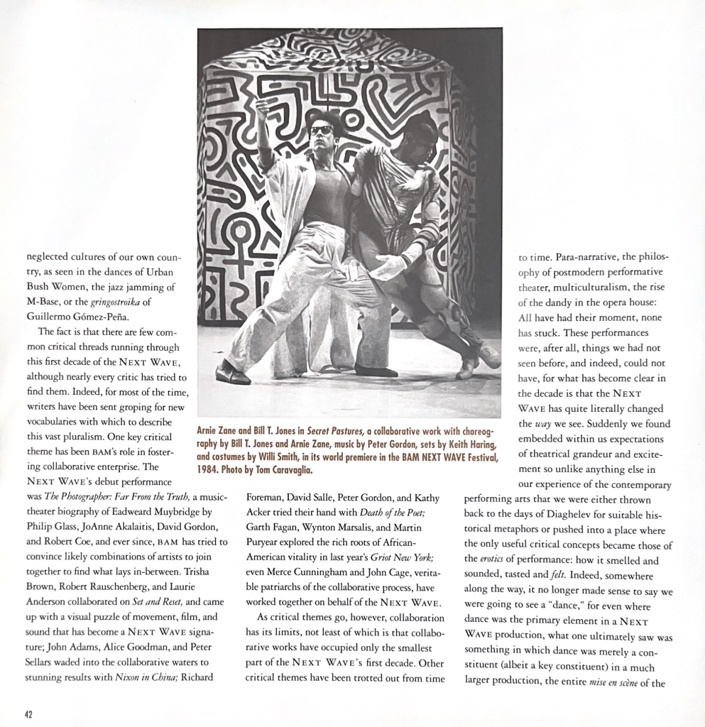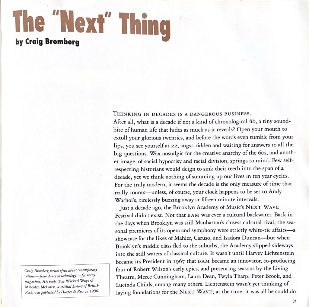 Writing about that moment—inside that moment—taught me about cultural transformation. Underground creative movements aren’t just entertainment but R&D for society. Downtown’s DIY ethics, challenge to authority, and openness to experiment and collaboration would resurface a decade later in digital culture, startups, and decentralized innovation. But change is inevitable. In 1992, when BAM asked me to write a retrospective of the amazing first decade of its Next Wave Festival, I realized I was writing an elegy.